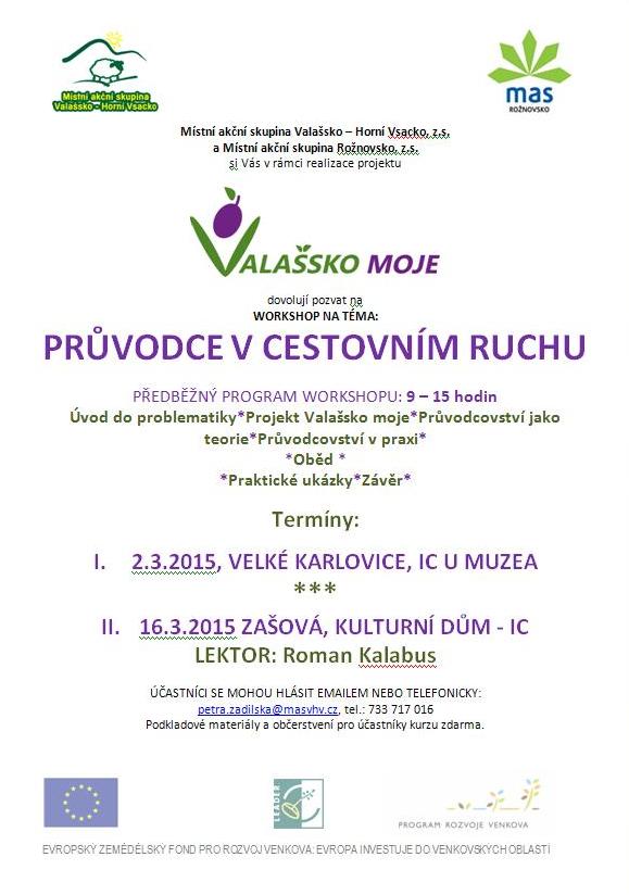 MAS Rožnovsko a MAS Valašsko - Horní Vsacko si Vás dovolují v rámci realizace projektu Valašsko Moje pozvat na workshop na téma Průvodce v cestovním ruchu. Workshop se uskuteční 2.3.2015 ve Velkých Karlovicích a 16.3.2015 v Zašové.
